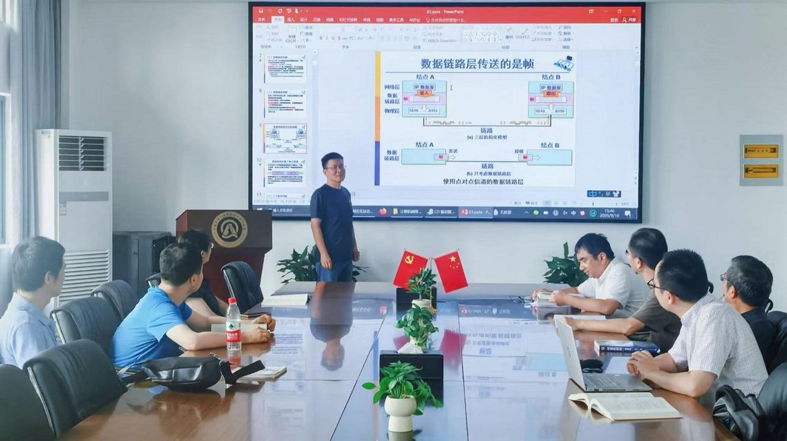 备课会由系主任张晓峰主持,会上,各位老师就课程的知识体系、教学重难点及实践案例进行了充分交流。系副主任陈老师首先分享了教材第2章“物理层”的教学设计,他通过生动的实物比喻和业界最新技术动态,将抽象的信号与介质知识讲解得通俗易懂。