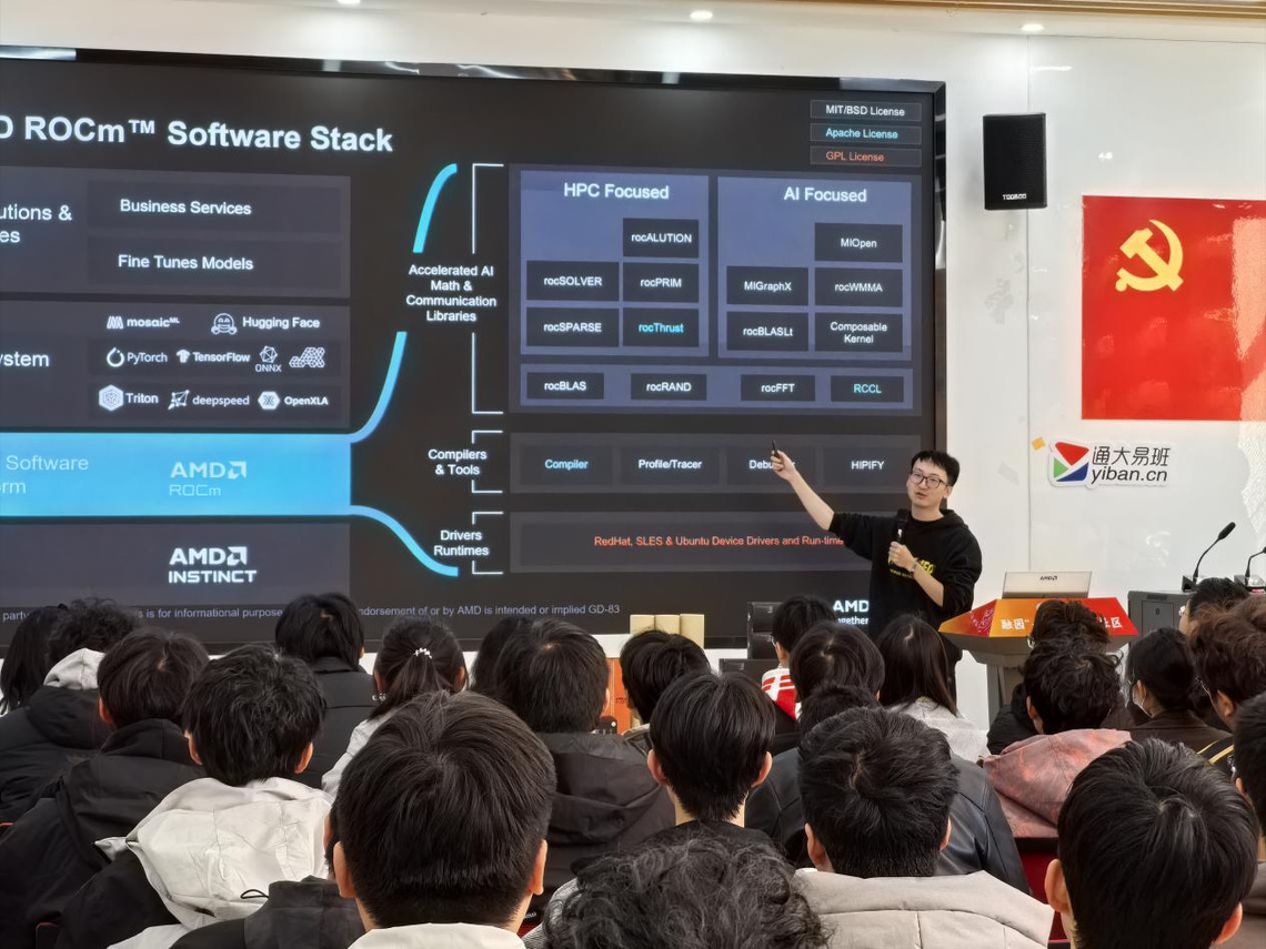 活动核心环节AI大课堂率先开讲。全国3D大赛组委会成员王树月老师聚焦“基于ROCm与Ryzen AI Max+395的AI部署及应用开发”主题,现场手把手指导,带领同学们在AI PC本地部署30-120B大模型、开发AI Agent应用的实战技巧。